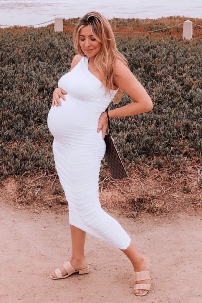White Ruched One Shoulder Maternity Dress
