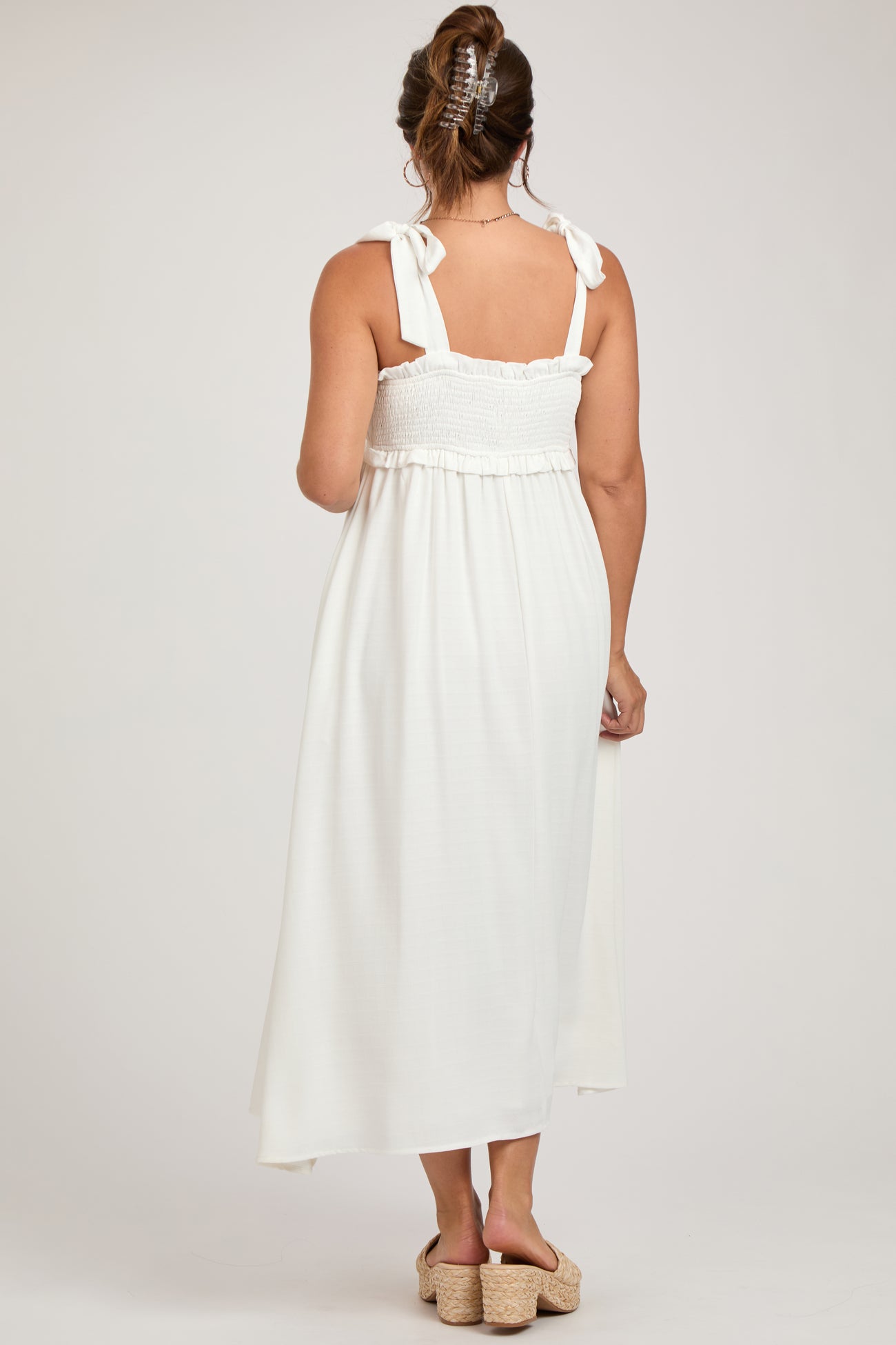 White Ruffle Accent Shoulder Tie Maternity Midi Dress