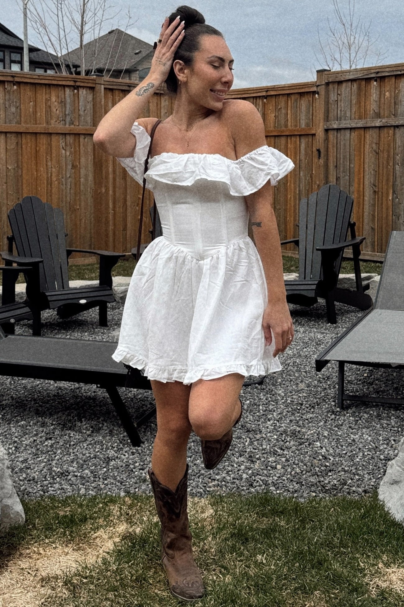 White Ruffle Off Shoulder Drop-Waist Mini Dress