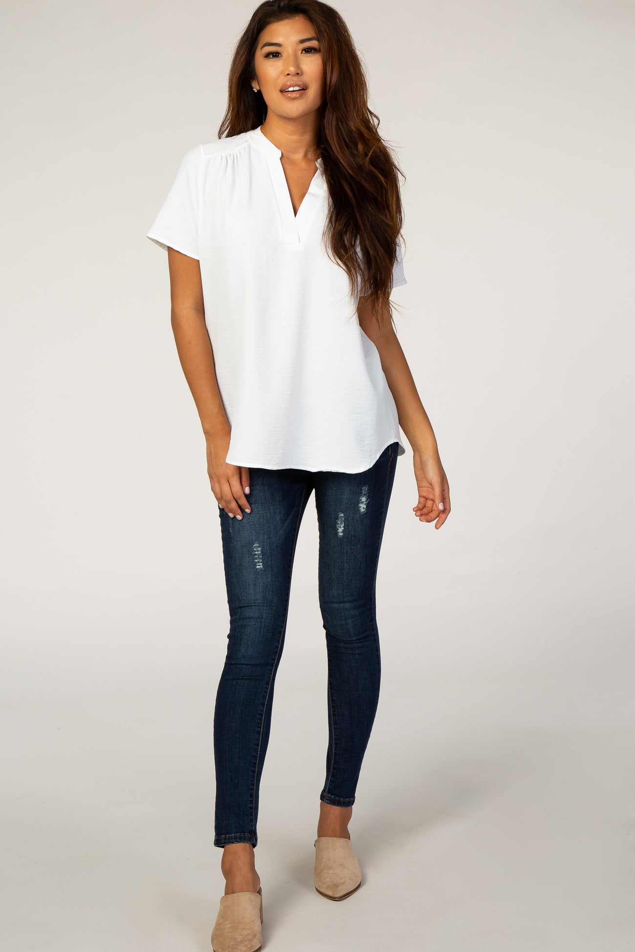 A solid hued blouse featuring short sleeves, a v-neckline, a higher collar and a slight drop shoulder.