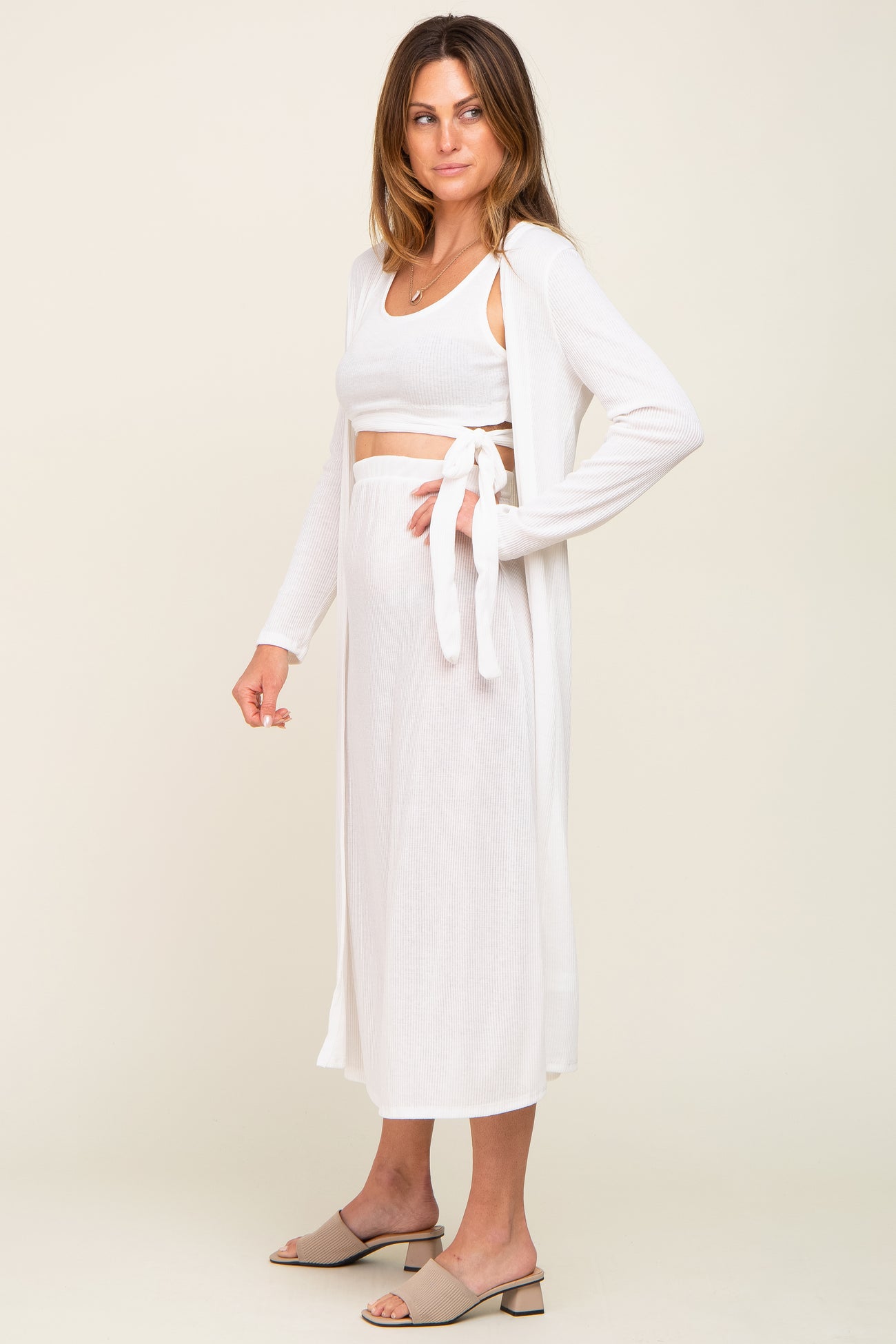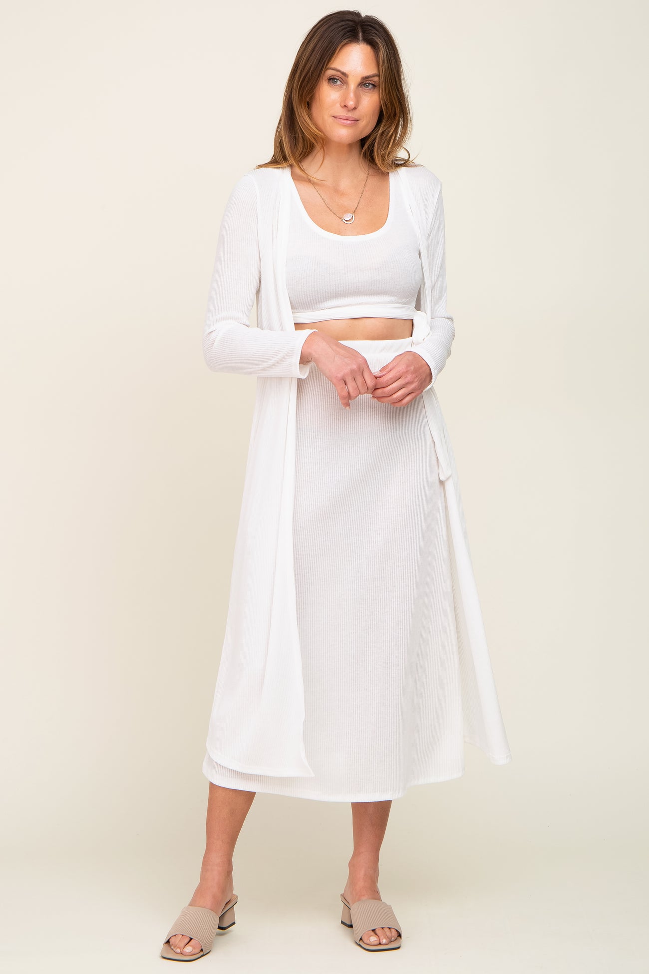 A 3-piece set featuring a crop top, fitted skirt, and cardigan.