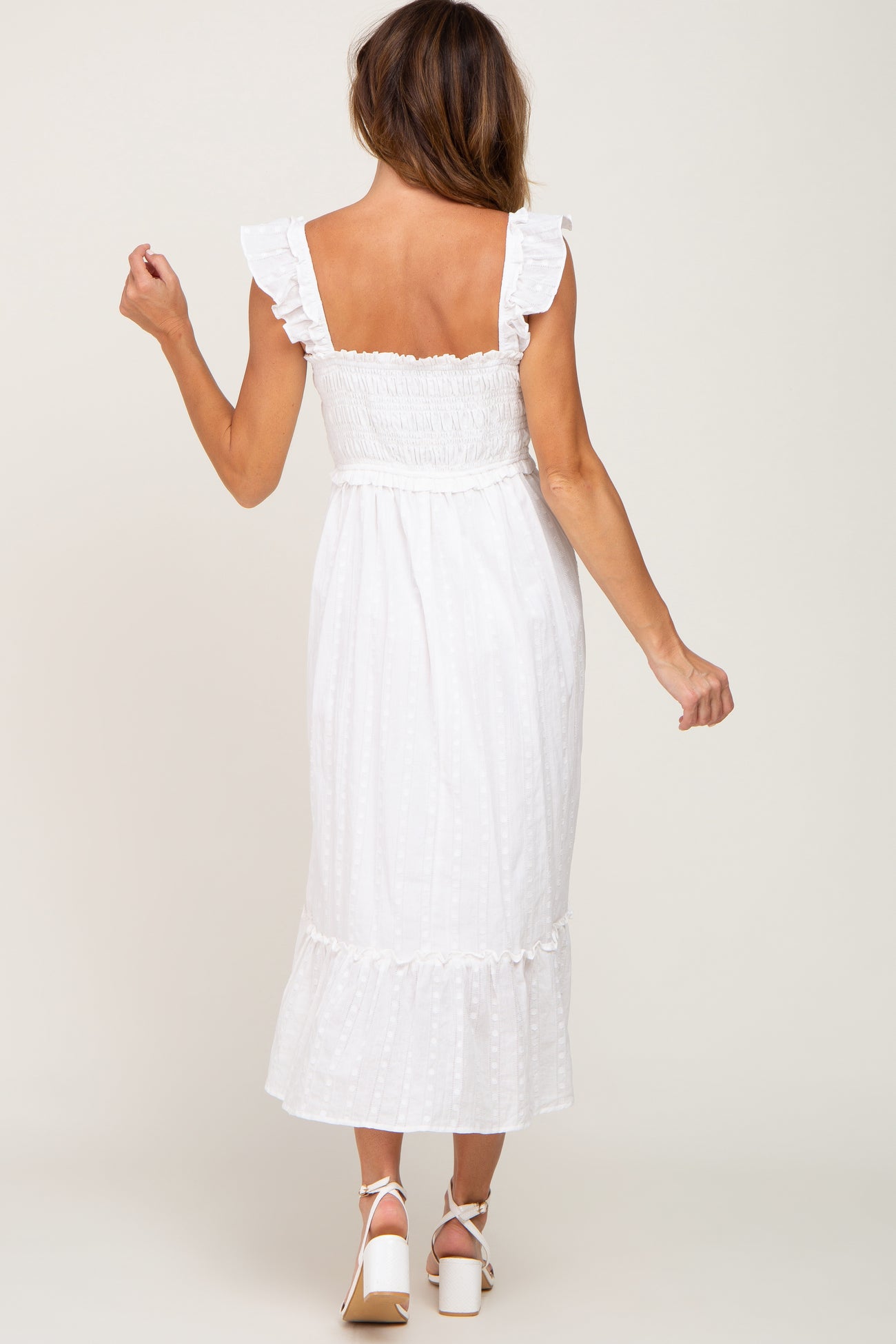 Details A textured midi dress featuring a smocked top, flutter straps, and a gathered bottom tier. Skirt is lined to prevent sheerness. Content + Care