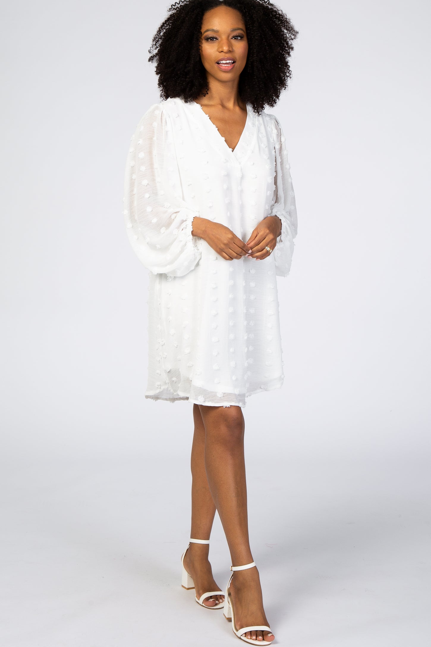 Details A solid chiffon long sleeve dress. Features large swiss dot design, long semi sheer bubble sleeves, and double lining in the body. This style runs small. Content + Care