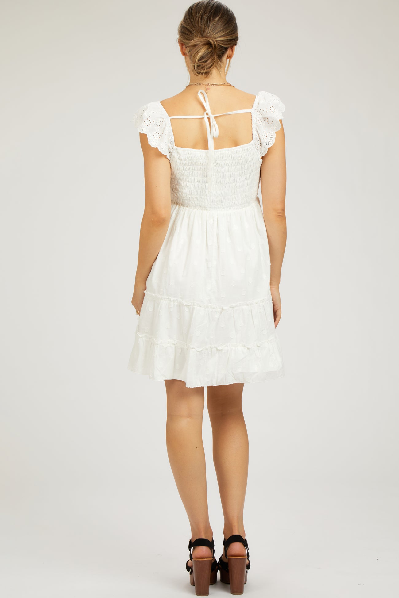 White Textured Polka Dot Eyelet Shoulder V-Neck Maternity Dress