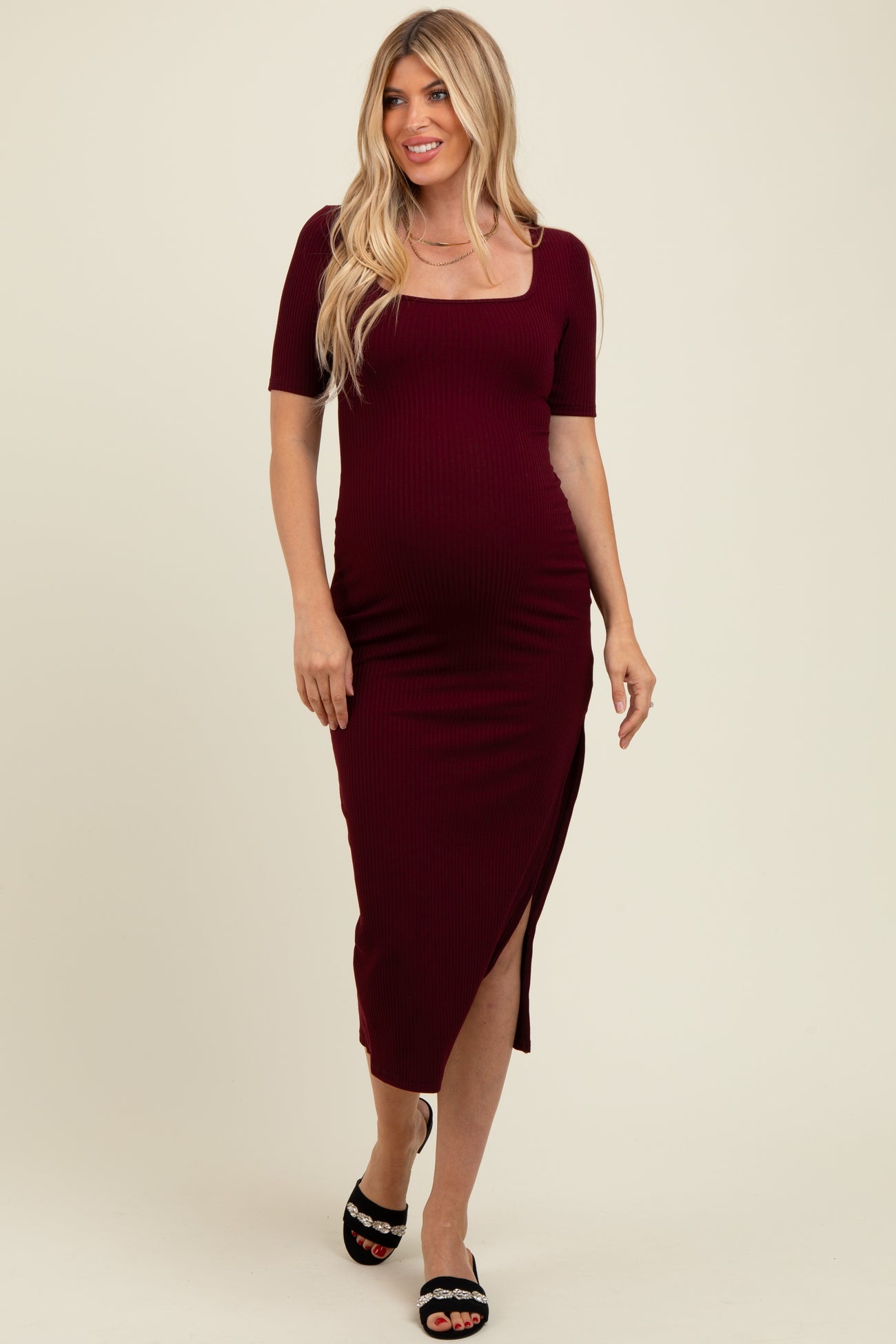 Elevate your maternity wardrobe with our Wine Short Sleeve Midi Slip Maternity Dress. Crafted from soft, stretchy ribbed fabric, this dress effortlessly hugs your bump for a flattering silhouette throughout pregnancy. The elegant midi length and square neckline add a touch of sophistication, while the short sleeves ensure comfort and breathability. Perfect for both casual outings and special occasions, this versatile wine-colored dress combines style with comfort. Pair it with heels or flats to complete your look. Embrace your pregnancy glow in this chic and comfortable slip dress designed to grow with you.