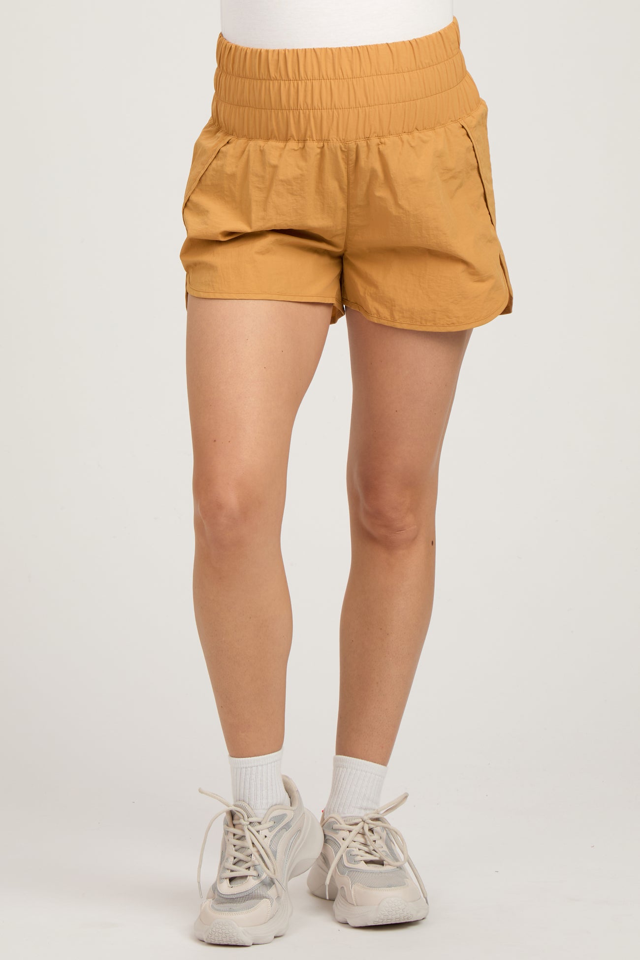 A pair of solid active maternity shorts featuring a curved slit hem and an elastic waistband.