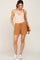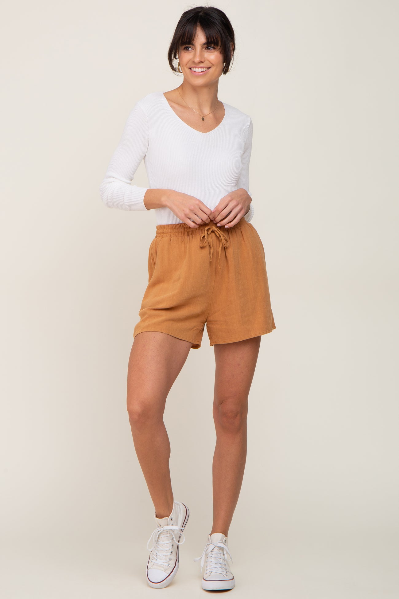 A pair of linen maternity shorts featuring an elastic waistband, an adjustable drawstring and side pockets.
