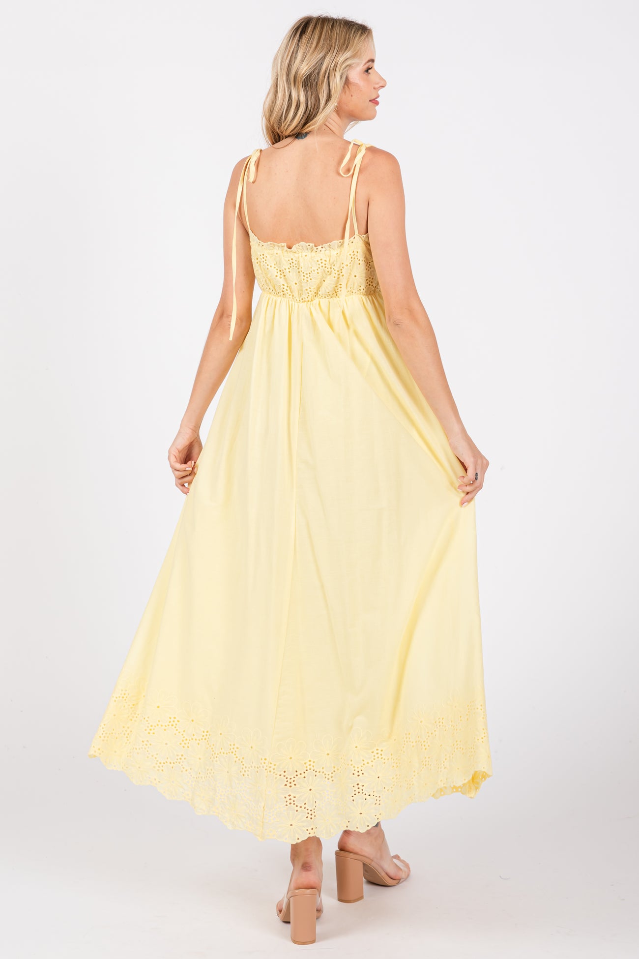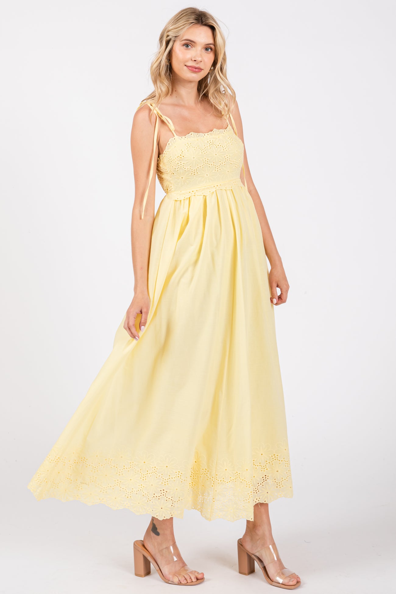 Yellow Eyelet Floral Shoulder Tie Dress