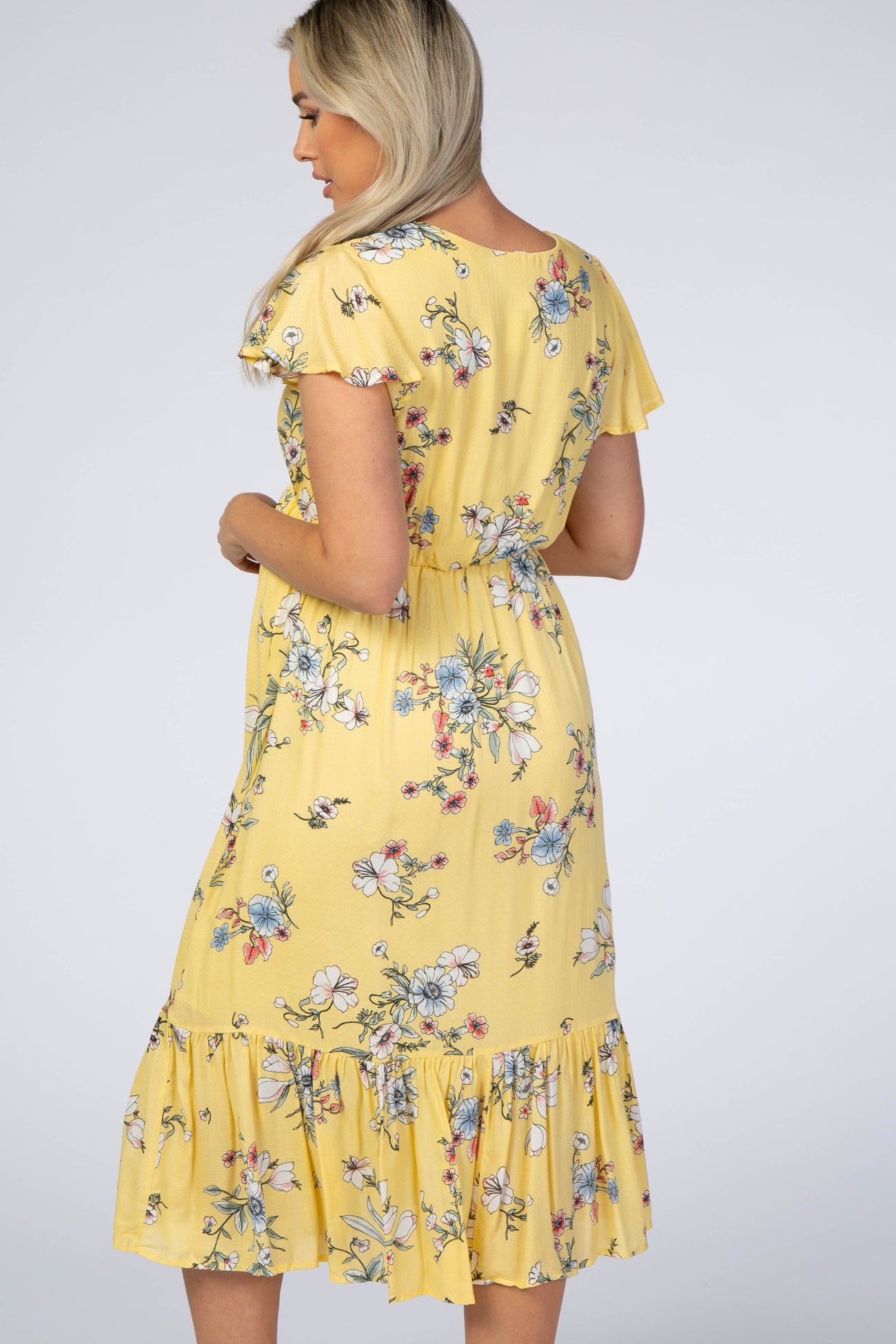 Yellow Floral Flounce Sleeve Midi Maternity Dress
