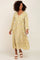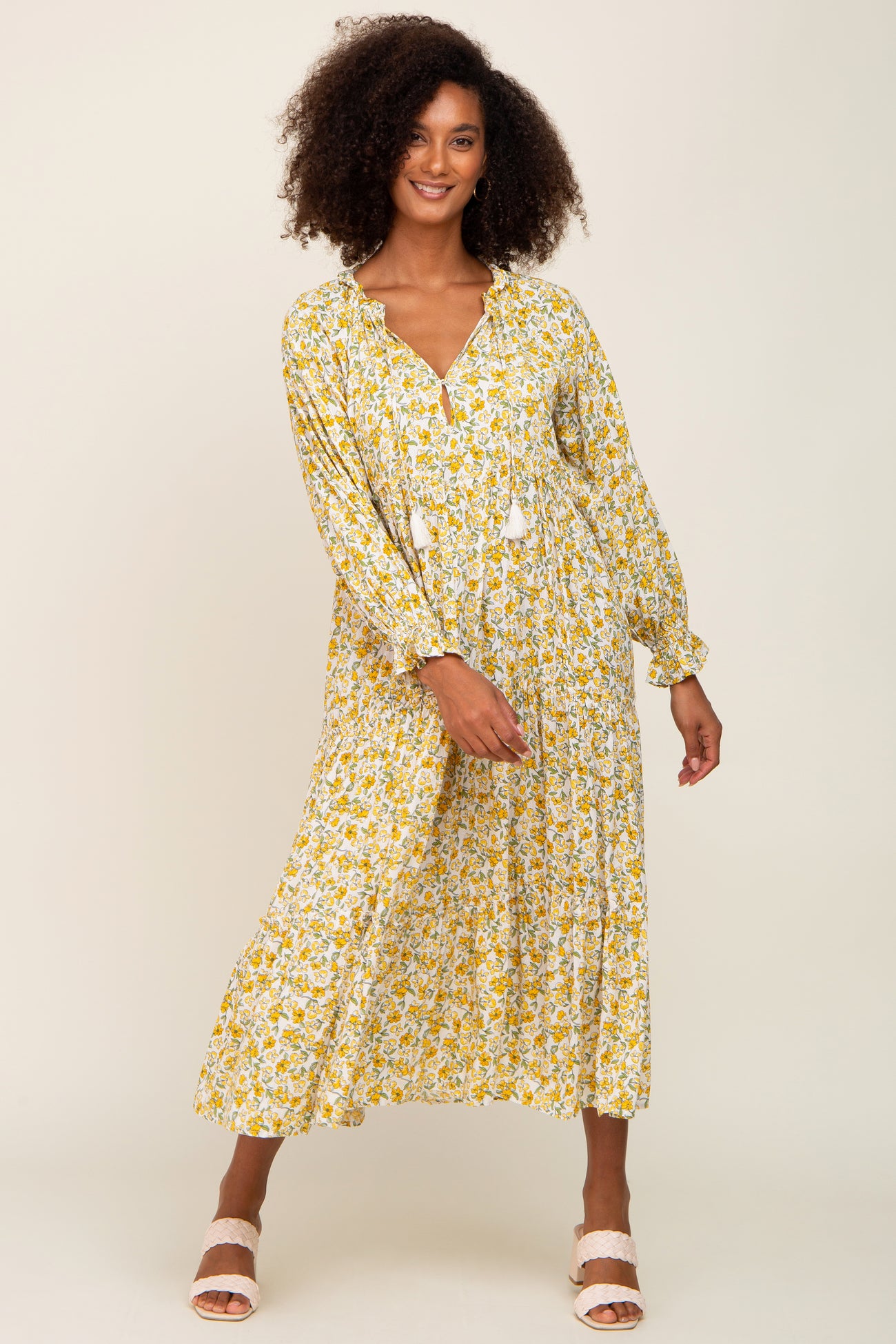 Yellow Floral Front Tie Long Sleeve Tiered Midi Dress