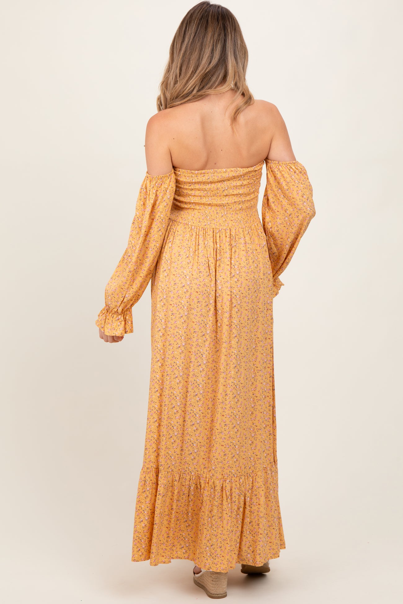 Yellow Floral Smocked Off Shoulder Maternity Maxi Dress