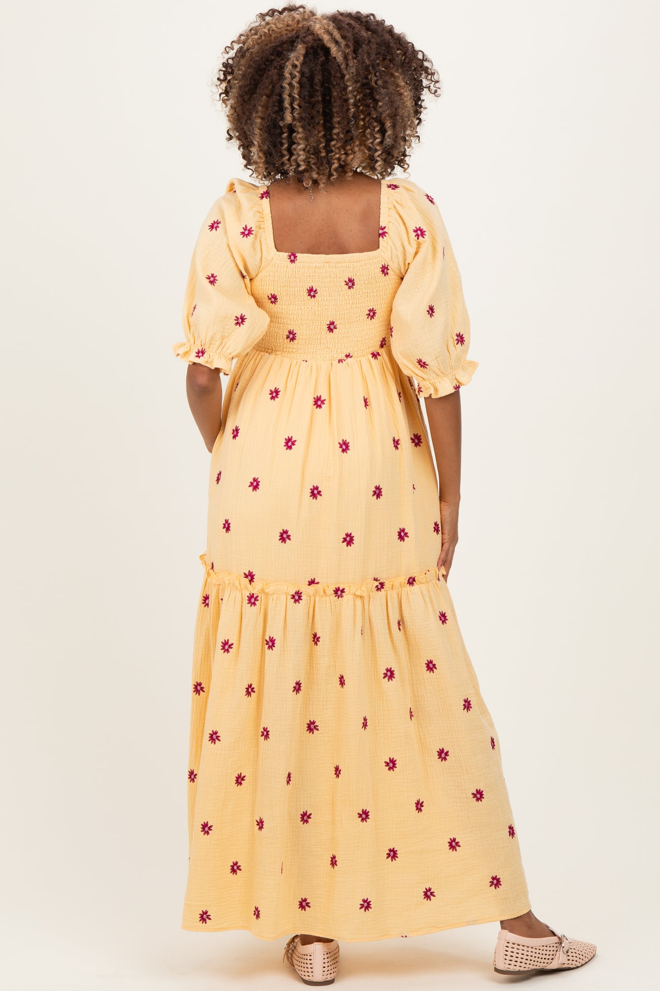 Yellow Floral Smocked Puff Sleeve Maternity Maxi Dress