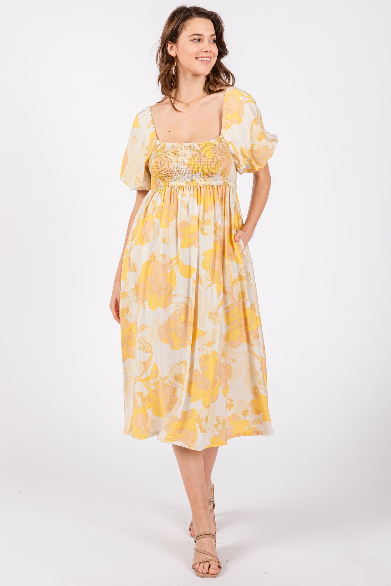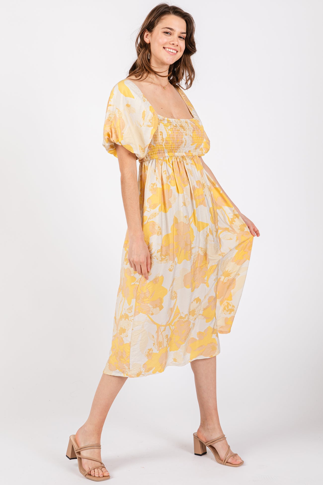 Yellow Floral Square Neck Smocked Short Puff Sleeve Midi Dress