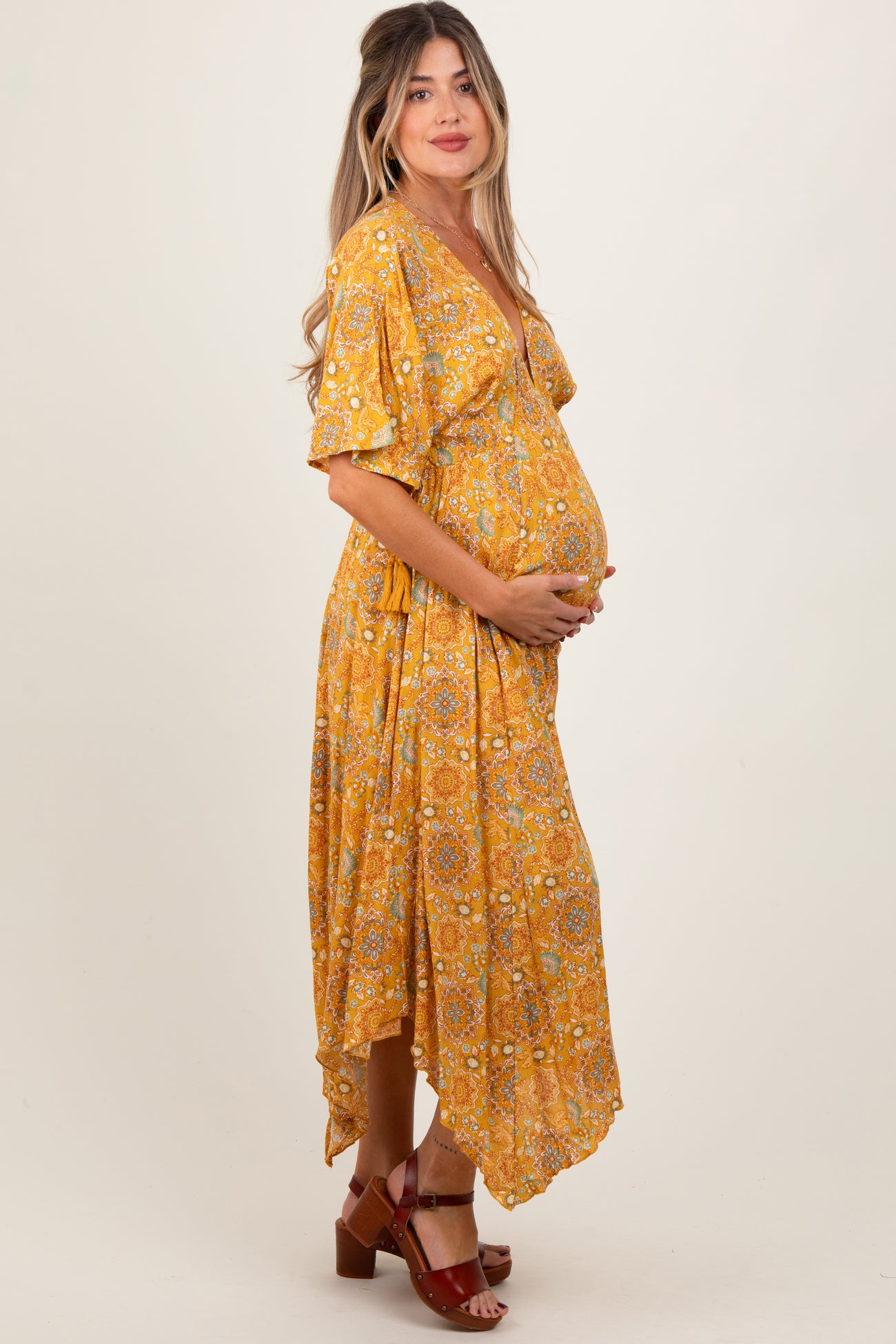 Yellow Printed Deep V-Neck Handkerchief Hem Maternity Maxi Dress