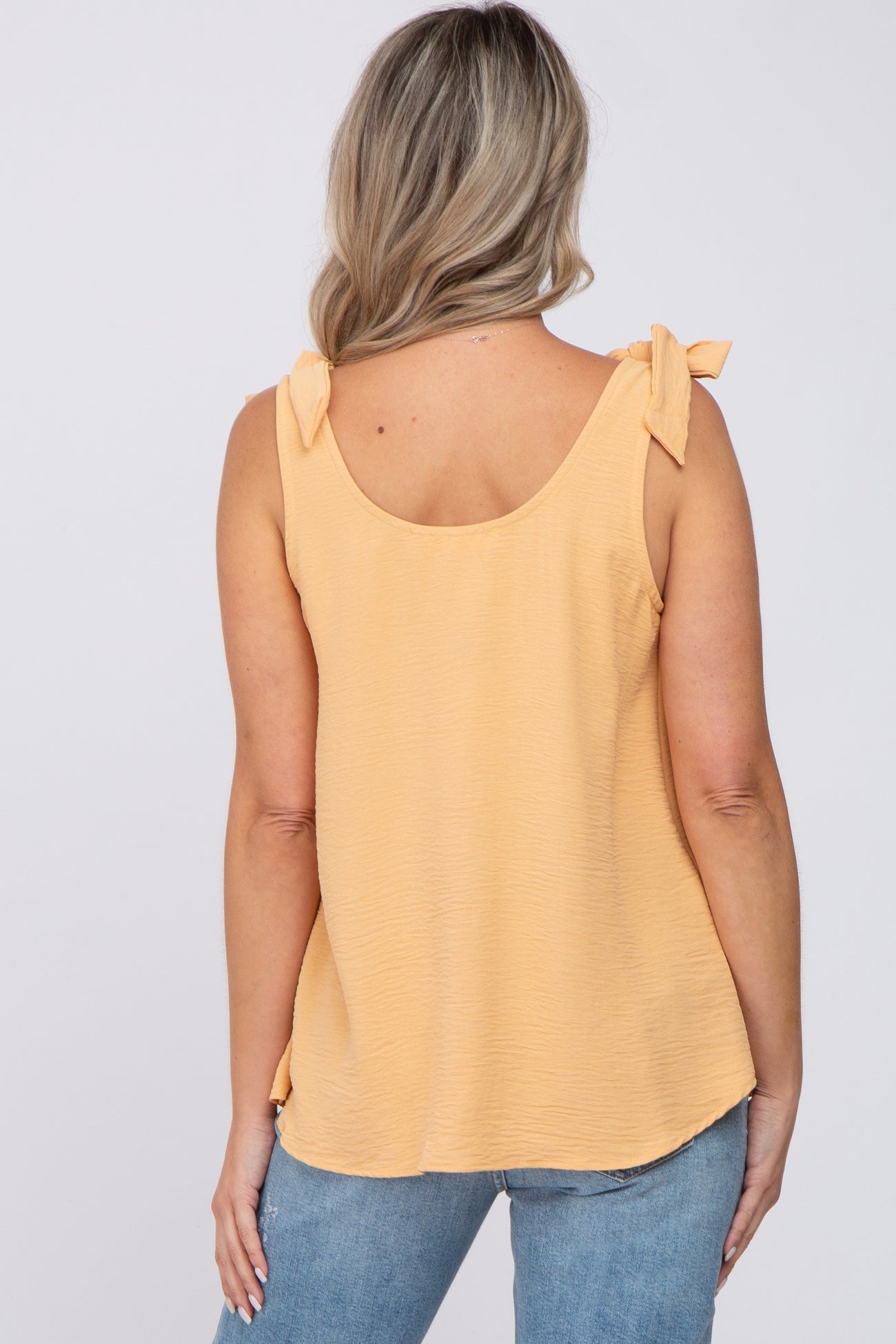 A solid hued maternity tank top featuring a scoop neckline, bows at the shoulder and a rounded hem.