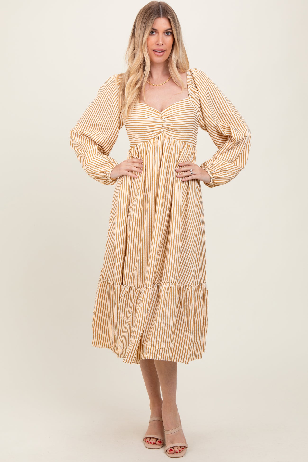 Yellow Striped Ruched Bodice Balloon Sleeved Midi Dress